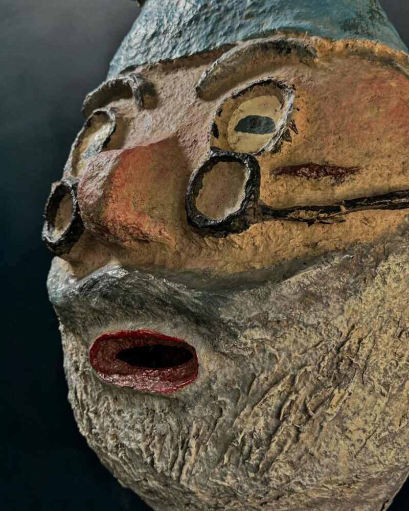 A totally unique and highly collectible piece of folk art in the form of a large hand painted papier-mâché mask. Timeworn in all the right places and for the most part in good solid condition with bright colours to the original paintwork. You won’t see another!